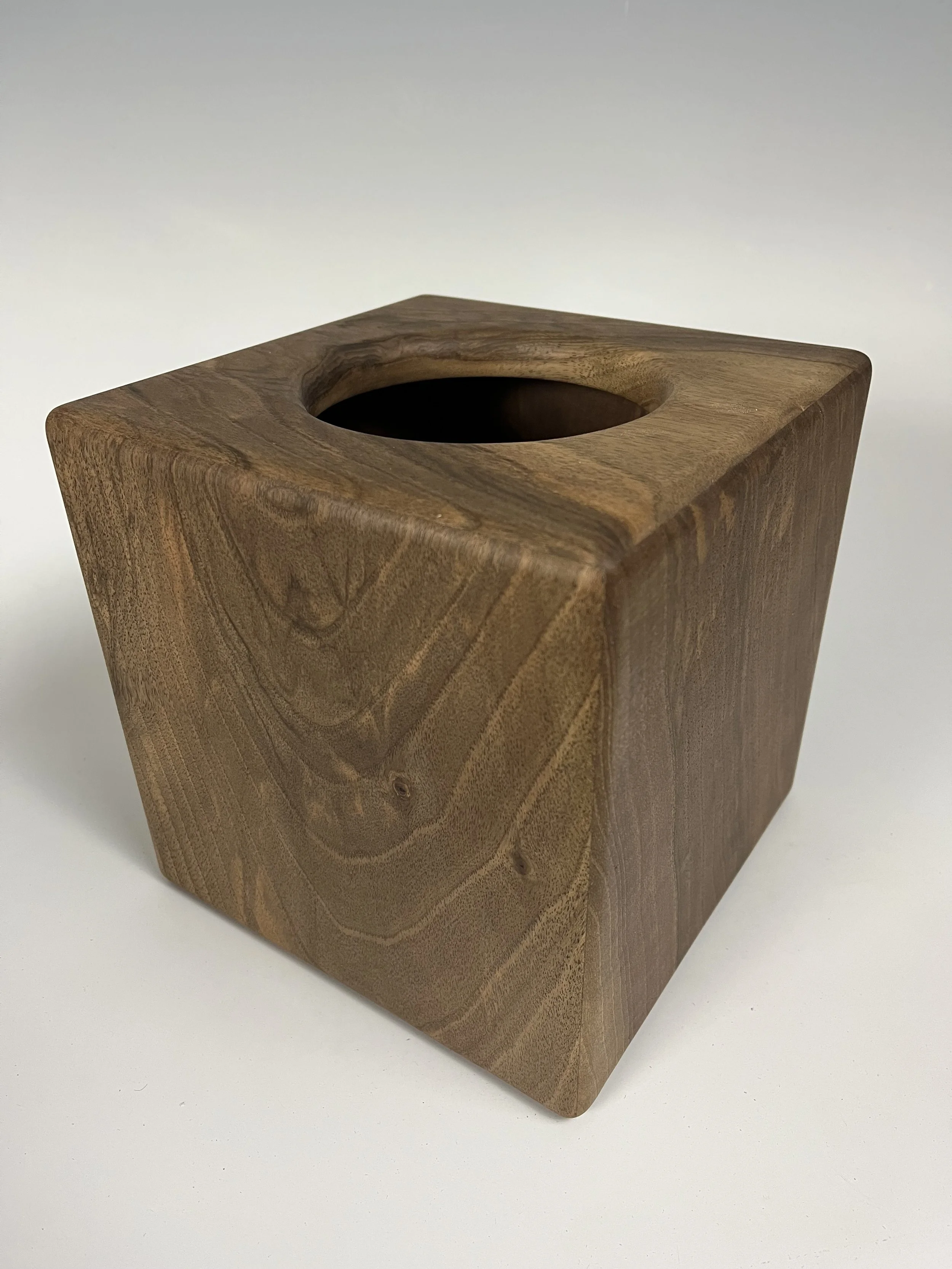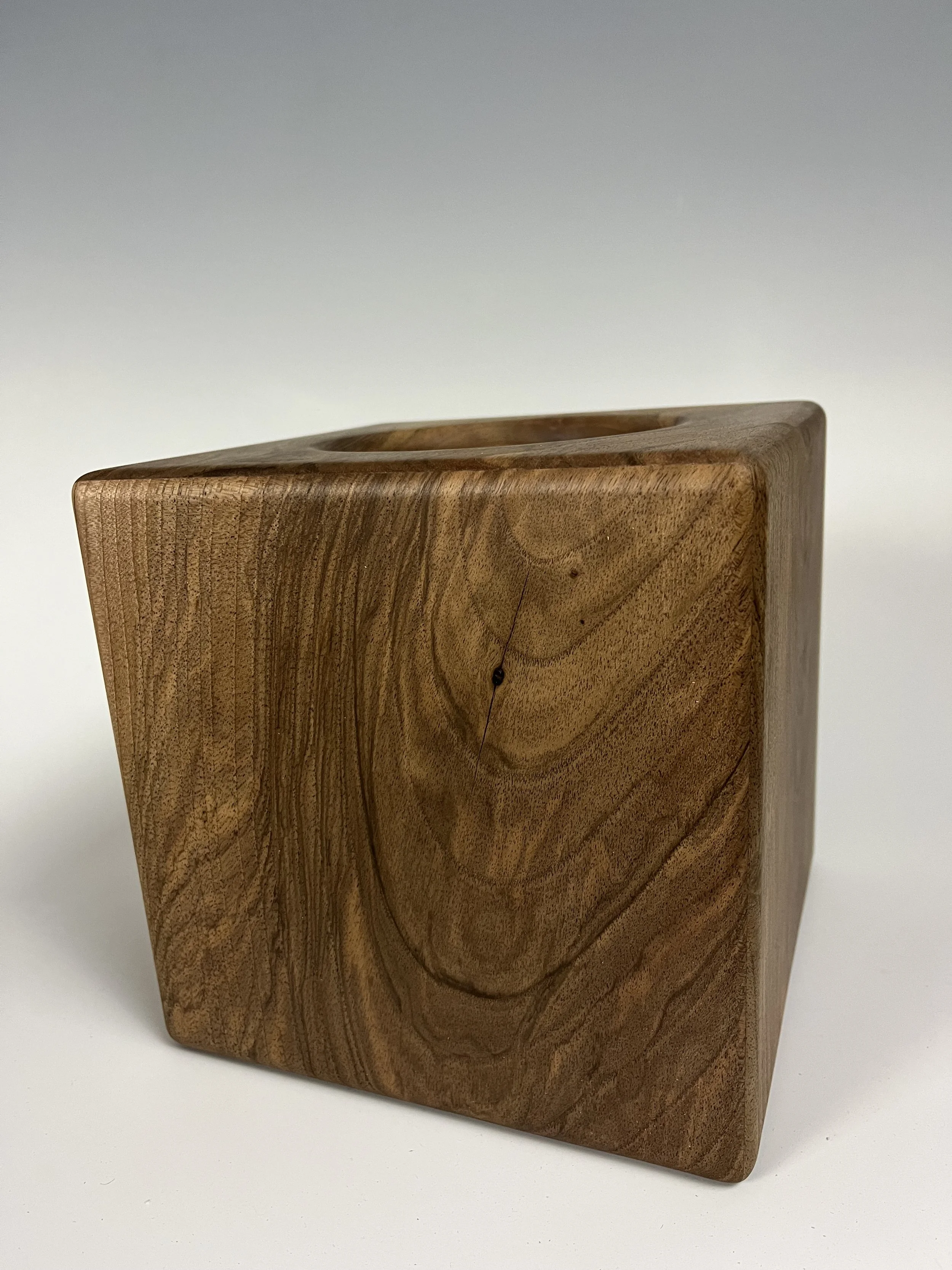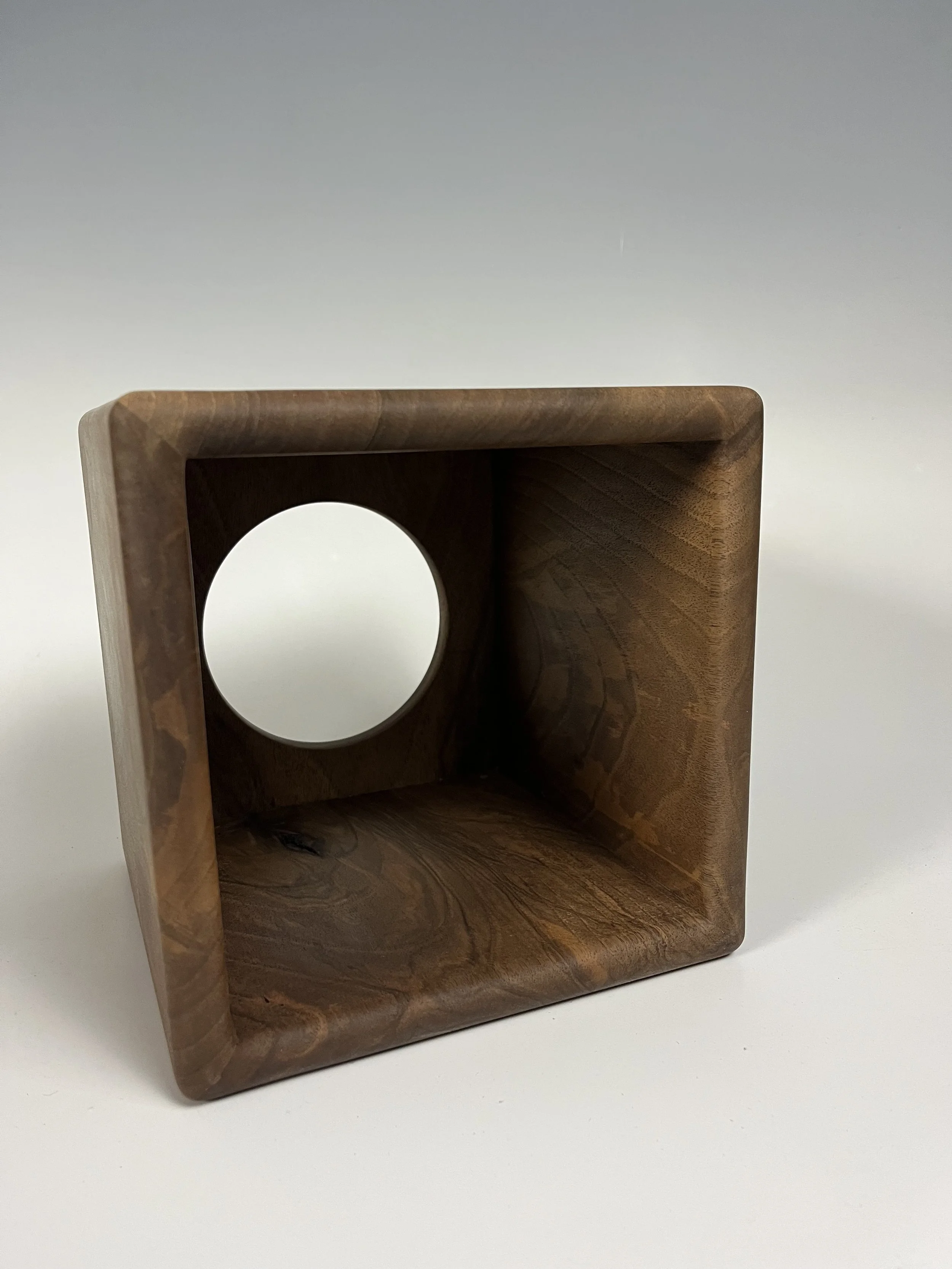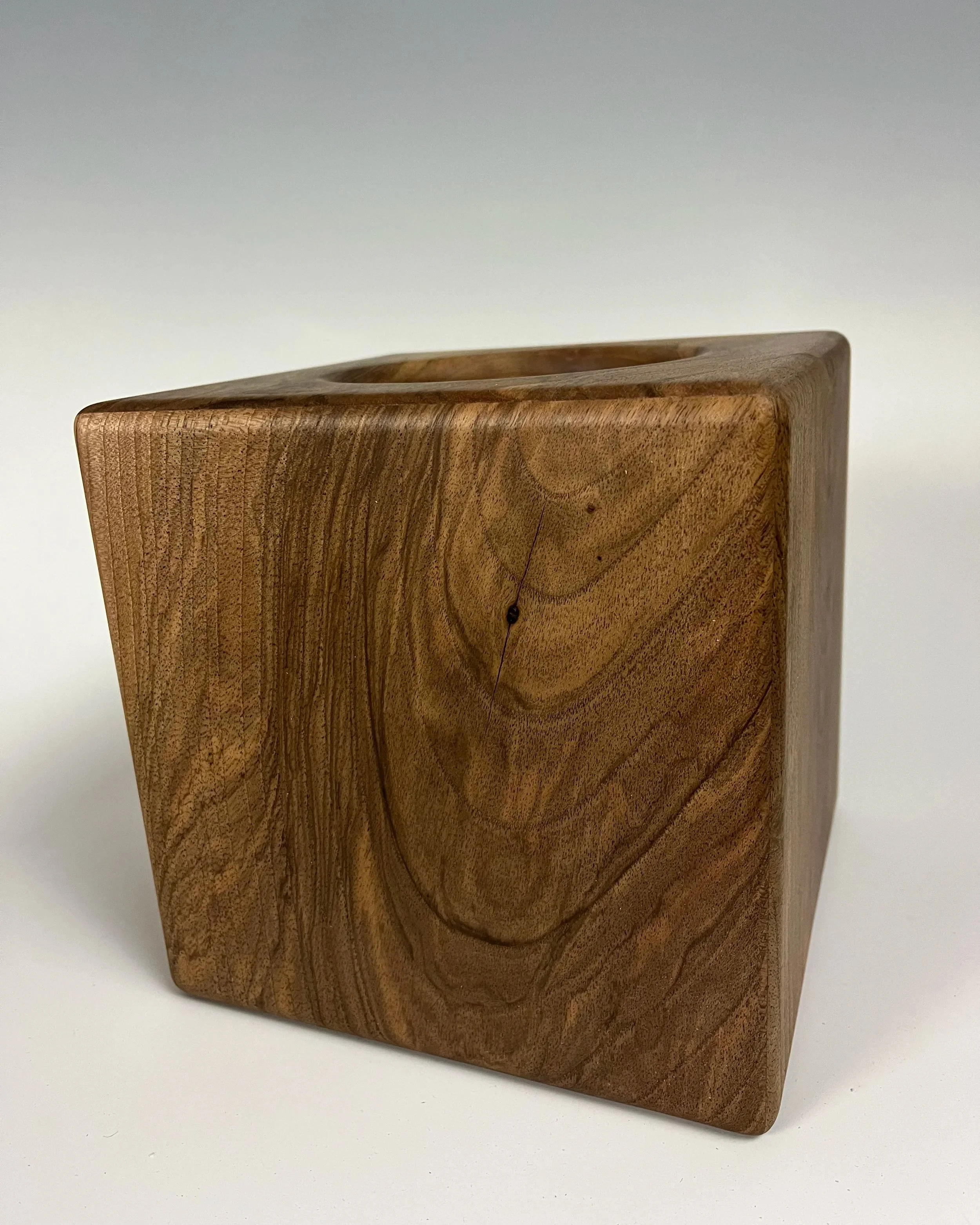 Fabrication d’un cube en noyer massif, avec un bois méticuleusement sélectionné pour sa teinte brun foncé profonde et homogène.